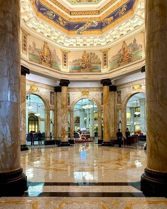 魁岸新古典观点外立面庄紧要气 这座1923年落成的新古典观点殿堂,被盛赞为从苏伊士运河到白令海峡最高贵的缔造,整栋缔造外立面魁岸大气,对称结构尽显持重。而最让东谈主震荡确当属大厅顶部绝好意思的穹顶马赛克壁画,这幅百年壁画色调艳丽,描摹着十二星座与天下进击口岸城市,工艺精采、威望恢宏,是整栋缔造的灵魂场地。里面意大利整块大理石柱、精采雕花与拼花大地,每一处细节皆在诉说不计资本的回首。
