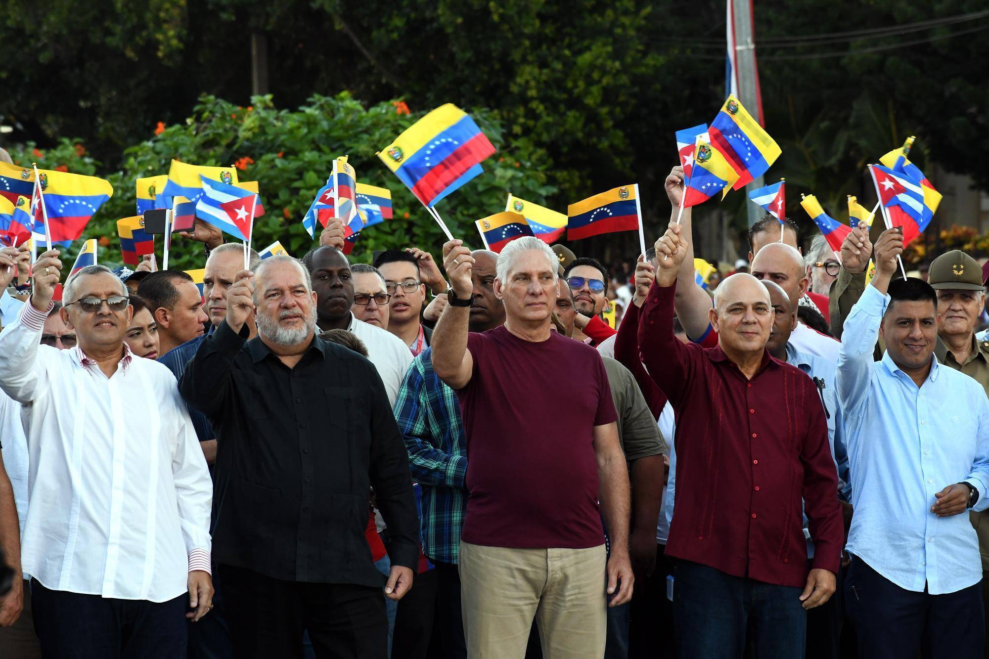 10月17日,5万多古巴群众聚会在都门哈瓦那总统正途的西蒙·玻利瓦尔雕像前,抗议好意思国军事威逼委内瑞拉,抒发对委内瑞拉东谈主民和政府的坚韧援助。古共中央第一秘书、古巴国度主席迪亚斯-卡内尔(前左三)等古巴党政指令东谈主以及委内瑞拉宇宙代表大会第一副主席佩德罗·因方特(前右一)出席聚会。新华社发(华金·埃尔南德斯摄)疑问四:把拉好意思不竭当“后院”?