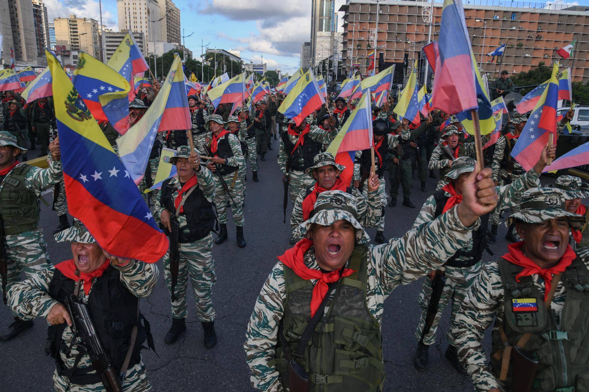 9月23日,在委内瑞拉都门加拉加斯,民兵组织成员挥舞委内瑞拉国旗进入游行。新华社发(马科斯·萨尔增多摄)疑问二:只为打击毒品私运?