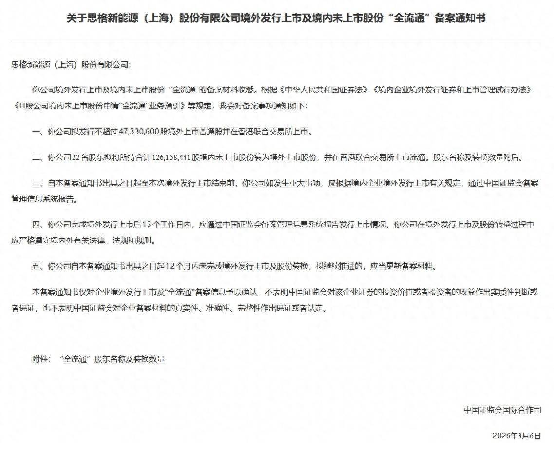 智通财经APP获悉,3月13日,中国证监会外洋配合司发布《对于想格新动力(上海)股份有限公司境外刊行上市及境内未上市股份“全运动”备案示知书》。想格新动力拟刊行不提升47,330,600股境外上市世俗股并在香港皆集往返所上市。该公司22名激动拟将所捏共计126,158,441股境内未上市股份转为境外上市股份,并在香港皆集往返所上市运动。